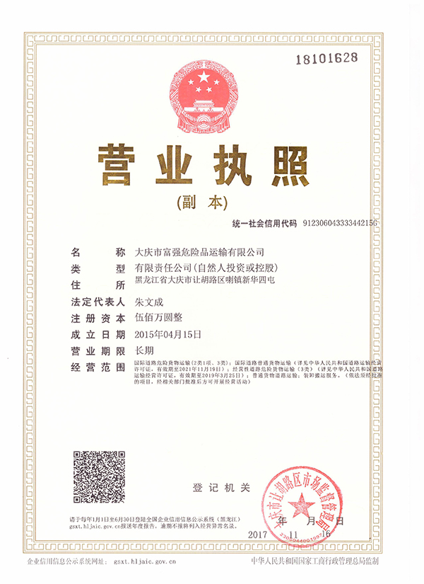 大慶市富強危險品運輸有限公司,隸屬于大慶市中慶集團,公司始建于2002年,是經大慶市交通局、省交通廳等有關部門核準成立,并取得了**道路運輸許可證(證號:黑交運管許可**字230469000006)和國內道路運輸危險品經營許可證(證號:黑交運許可慶制230604100030)。公司注冊資金500萬元,運輸能力50萬噸/年,銷售額25億元/年,年利稅3.1425億元。